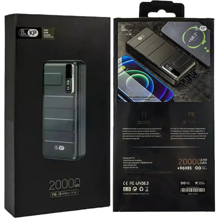 پاوربانک KP مدل PD-22 با ظرفیت 20000 میلی آمپر از حجم بسیار عالی برای شارژ انواع دیوایس های الکترونیکی بهره میبرد. با توجه به ظرفیت بالایی که شارژر همراه PD-22 دارد؛ وزن پاوربانک 430 گرم بوده که کمی سنگین وزن محسوب میشود. شارژر همراه KP PD-22 دارای 4 درگاه ورودی و خروجی است که در واقع به صورت کامل هر گونه محدودیت برای شارژ پاوربانک یا دریافت شارژ از پاوربانک را برای کاربران تلفن همراه از بین میبرد. شارژر همراه PD-22 با 2 عدد درگاه خروجی شارژ از نوع USB و 2 عدد درگاه ورودی شارژ microUSB و USB-C نیاز شما را در هر حالت برطرف میکند. با فشردن کلید پاور در گوشه بالا سمت چپ، پاوربانک PD-22 روشن میشود و میزان شارژ موجود در شارژر همراه که به صورت عددی بین 0 تا 100 هست بر روی نمایشگر نمایش داده میشود. طراحی پاوربانک KP PD-22 به زیبایی انجام شده و لبه های نرم، نوار آینه ای و بدنه مات احساس خوشایندی را در زمان استفاده از پاوربانک PD-22 برای شما به وجود می آورد. وجود 2 عدد درگاه خروجی شارز باعث میشود تا در یک زمان بتوانید گوشی های موبایل خود را با سرعت بالایی شارژ نمایید.